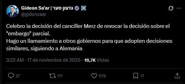 El ministro de Exteriores israelí, Gideon Sa’ar, celebró la decisión y pidió a otros países seguir el ejemplo alemán.
