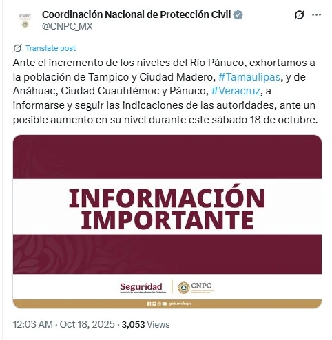 Ante el incremento en los niveles del río Pánuco, la Coordinación Nacional de Protección Civil mantiene la alerta y exhortó a la población de Tampico y Ciudad Madero, en Tamaulipas, así como de Anáhuac, Ciudad Cuauhtémoc y Pánuco, en Veracruz, a mantenerse informada y seguir las indicaciones de las autoridades.