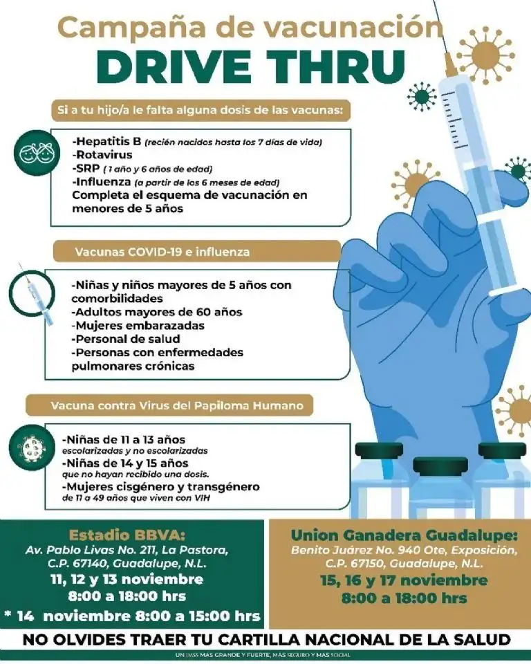 Guadalupe.- El Instituto Mexicano del Seguro Social (IMSS) en Nuevo León publicó una nueva campaña de vacunación ante varias enfermedades a través de módulos drive thru.