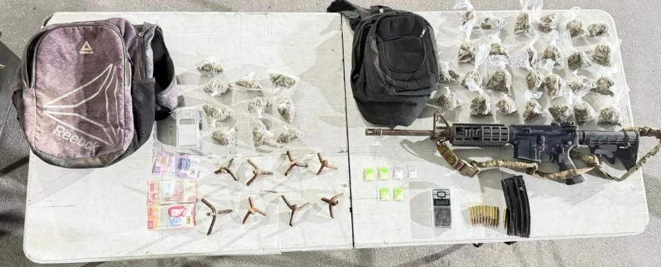 Tras una persecución a pie y mediante comandos verbales, los oficiales aseguraron a los inculpados, a quienes se les practicó una revisión precautoria. En sus pertenencias se localizó un arma larga con su cargador y 10 cartuchos hábiles; 37 bolsas con hierba verde y seca con características similares a la marihuana; seis bolsas con sustancia granulada y cristalina con características de la droga conocida como cristal; ocho objetos metálicos punzocortantes llamados ponchallantas; dos básculas grameras digitales y dinero en efectivo.