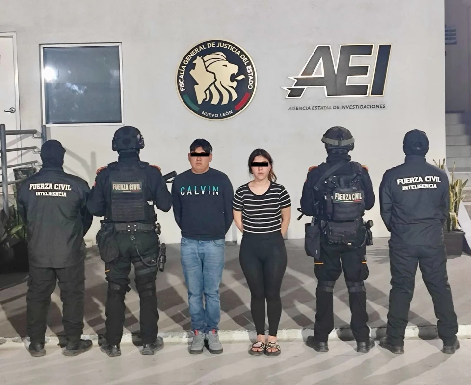 Tras una investigación, elementos de Fuerza Civil detuvieron en Apodaca, Nuevo León, a una pareja en posesión de droga, señalada como presunta integrante de un grupo delictivo.