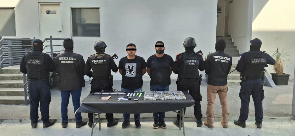 Los sospechosos fueron interceptados en un Nissan Versa sobre la carretera Monterrey-Reynosa. Durante la revisión se les aseguró un arma corta abastecida, 39 dosis de cristal, 20 envoltorios de cocaína y 20 de marihuana.