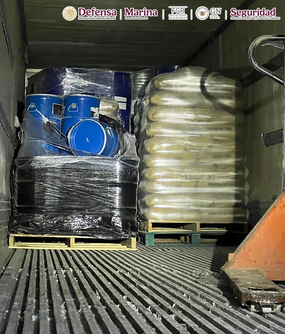Los hechos se registraron durante una inspección a un tractocamión con caja seca, cuyo conductor fue detenido. En el interior se localizaron 300 costales con 7 toneladas y media de acetona de plomo, 900 kilos de ácido tartárico, cuatro mil litros de etanol, 4 toneladas de sosa cáustica, 3 mil litros de otros químicos, además 100 kilos de una sustancia sólida blanca presumiblemente utilizada para la fabricación de drogas sintéticas.