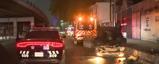 Por una presunta dormitada, un automovilista volcó su vehículo en la lateral de la avenida Fidel Velázquez, luego de chocar con la banqueta, en Monterrey, Nuevo León.