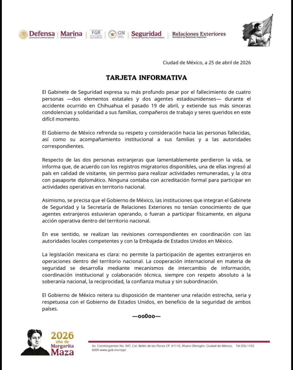 Tras expresar su pesar por el fallecimiento de dos elementos estatales y dos agentes estadounidenses en un accidente en Chihuahua el pasado 19 de abril, el Gabinete de Seguridad señaló que no tenía conocimiento de que los extranjeros participaran en alguna acción operativa dentro del territorio nacional.