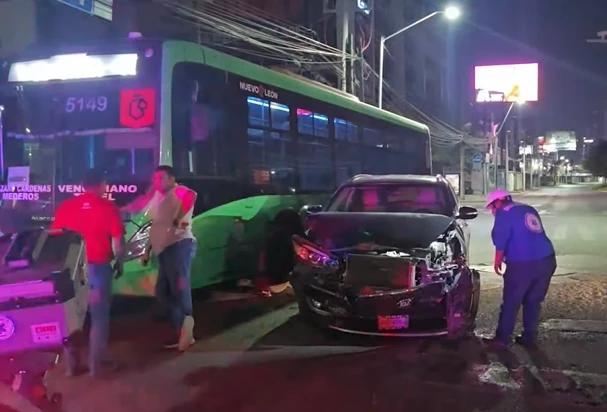 Al presuntamente ignorar la luz roja de un semáforo, el chofer de un camión urbano de la ruta 30 – Venustiano Carranza Túnel impactó una camioneta particular en el cruce de las avenidas Lázaro Cárdenas y Alfonso Reyes, al sur de Monterrey, Nuevo León.