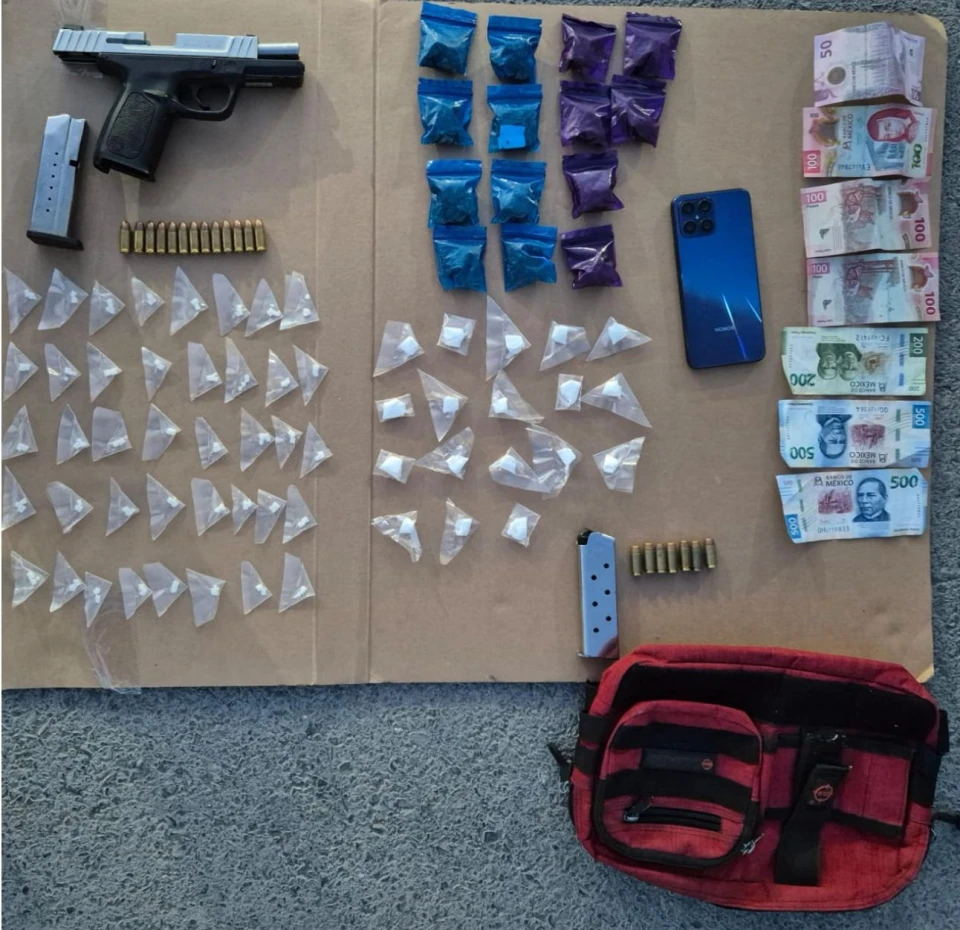 Durante la detención, los uniformados les decomisaron: un arma corta abastecida con 13 balas, un cargador abastecido con siete balas, 40 dosis de una sustancia sólida parecida a la cocaína en piedra, 18 con un polvo blanco similar a la cocaína, 14 envoltorios con hierba verde y seca con las características de la marihuana, un celular y mil 550 pesos en efectivo.