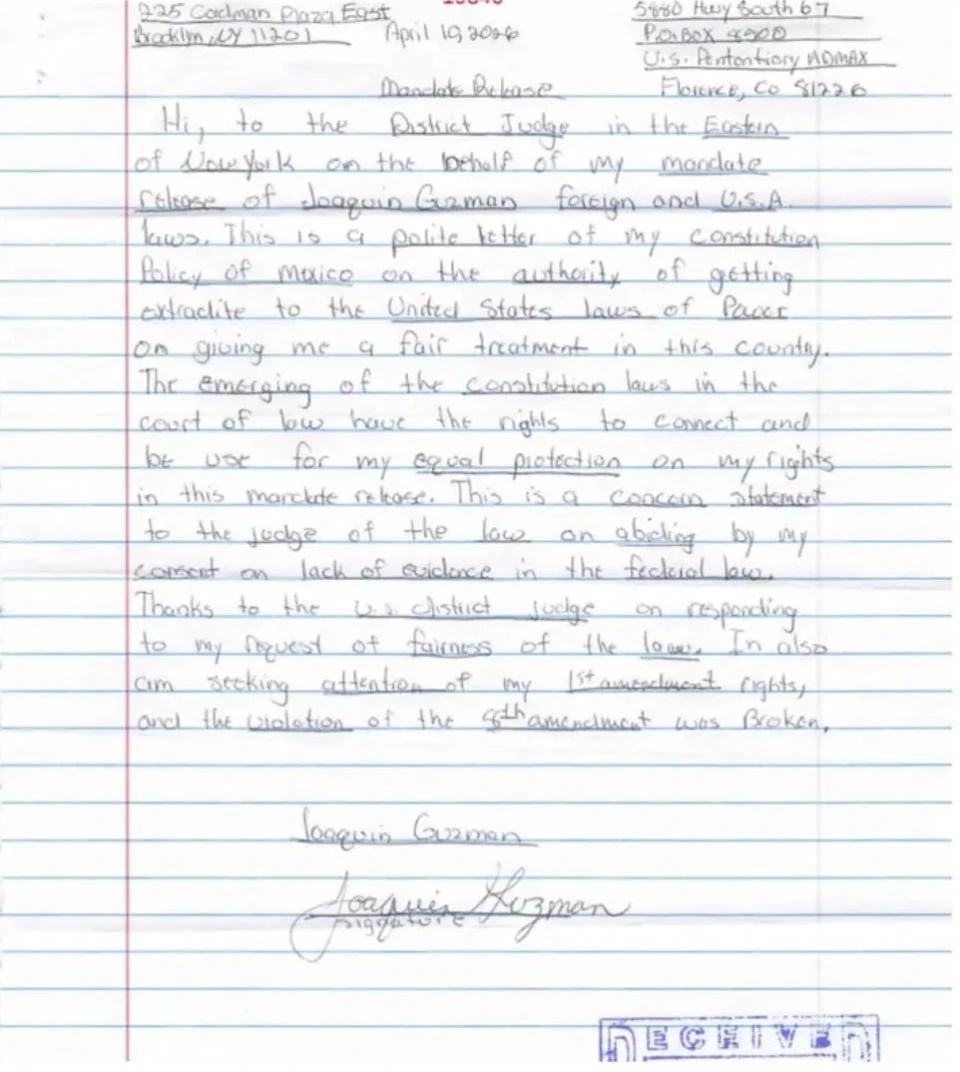 Joaquín ‘El Chapo’ Guzmán, quien cumple cadena perpetua en la prisión de máxima seguridad ADX Florence, en Colorado, Estados Unidos, envió una nueva carta para quejarse ante el juez Brian Cogan.