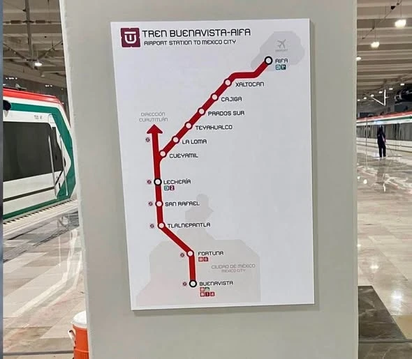 El tren comienza de Buenavista y recorre estaciones como Fortuna, Tlalnepantla, San Rafael y Lechería, desde donde continúa por el nuevo ramal hasta el AIFA, con un tiempo estimado de 45 minutos.