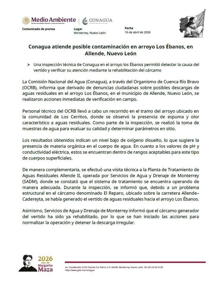 La Comisión Nacional del Agua (Conagua), a través del Organismo de Cuenca Río Bravo (OCRB), informó que realizó una inspección técnica en el arroyo Los Ébanos, en el municipio de Allende, Nuevo León, tras denuncias ciudadanas por posibles descargas de aguas residuales.