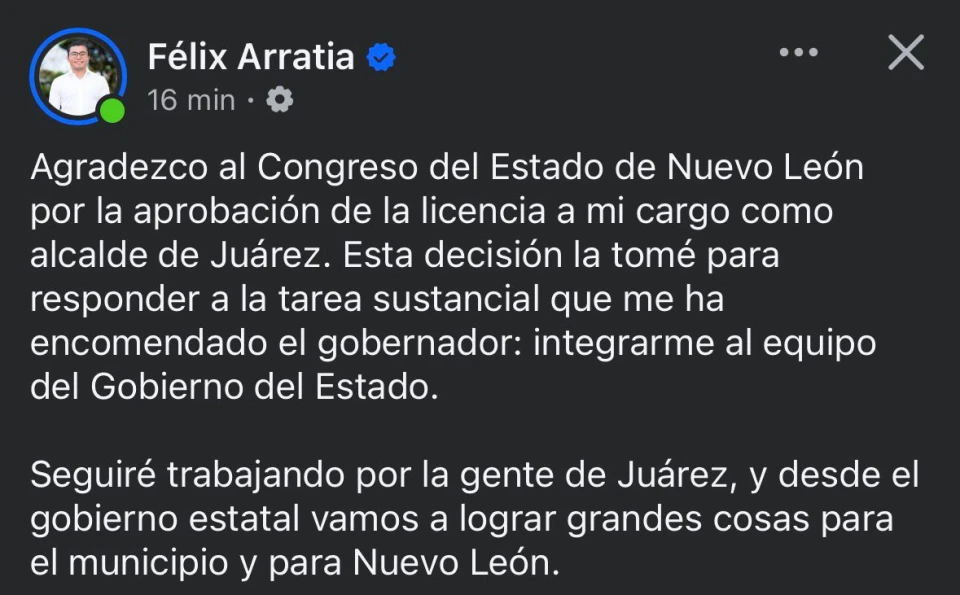 En fast track, el Congreso del Estado de Nuevo León discutió y aprobó la licencia indefinida del alcalde de Juárez, Félix Arratia Cruz, así como la designación de Mónica Marisela Oyervides Acosta como presidenta municipal sustituta. El debate se dividió entre quienes defendieron la institucionalidad del proceso y los que denunciaron nepotismo y corrupción.