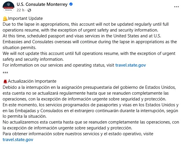 El Consulado de Estados Unidos en Monterrey, Nuevo León, informó que, debido al cierre presupuestal del gobierno, su cuenta de Facebook no se actualizará de manera regular hasta que se reanuden por completo las operaciones, con excepción de la difusión de información urgente relacionada con seguridad y protección.