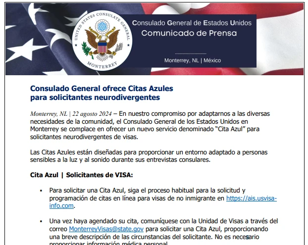 El Consulado General de Estados Unidos en Monterrey ofrecerá un nuevo servicio denominado “Cita azul” para solicitantes neurodivergentes de visas.