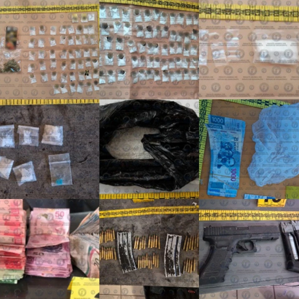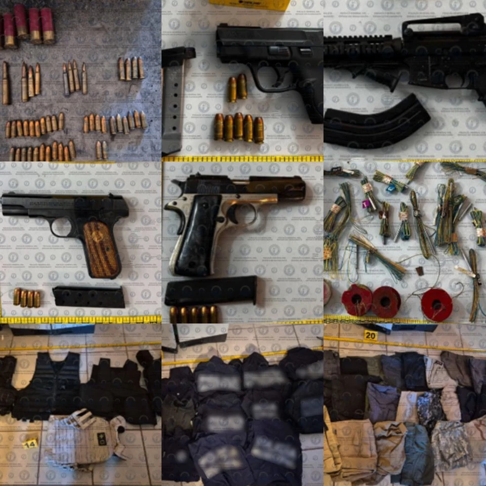 Durante cateos realizados en diez inmuebles en los municipios, San Francisco del Rincón y Purísima del Rincón y la capital del estado, donde aseguraron 14 mil 393 dosis de droga, seis armas de fuego, 22 vehículos (11 de ellos con reporte de robo), explosivos, equipo táctico, teléfonos y 39 mil 860 pesos en efectivo.