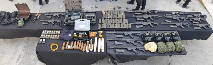 Como resultado, fueron aseguradas 14 armas largas, 94 cargadores, dos armas cortas, ocho cascos y 14 chalecos balísticos, siete fornituras, una chamarra con emblema policial, un equipo inhibidor de señal, dos drones y diverso material para la fabricación de explosivos.