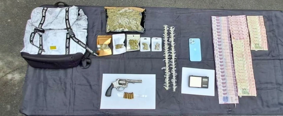 Tras una intervención protocolaria le aseguraron 1 arma de fuego abastecida, 49 dosis de una sustancia con las características de la cocaína en piedra, 6 bolsas con hierba verde parecida a la marihuana, así como 2 mil 120 pesos en efectivo.