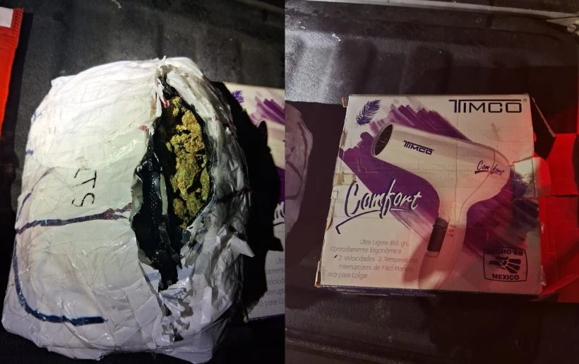 En su interior había una caja de cartón que simulaba contener una secadora, pero dentro se halló un paquete de plástico encintado con hierba verde similar a la marihuana.