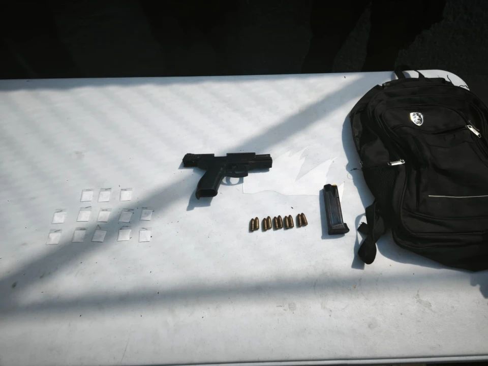 Durante la revisión, se le aseguró una mochila con un arma de fuego, un cargador con 10 cartuchos útiles y los envoltorios con droga. Por lo que fue puesto a disposición del Ministerio Público, mientras se investigan sus posibles vínculos con actividades ilícitas.