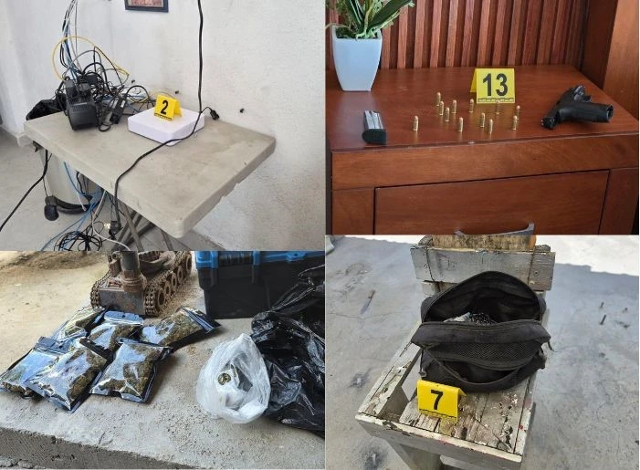 Además, se decomisaron 12 vehículos, un arma de fuego calibre 9 mm, 12 cartuchos útiles, un cargador, diversas cantidades de presuntas sustancias ilícitas empaquetadas, dinero en efectivo en distintas denominaciones guardado en bolsas negras, dispositivos electrónicos, binoculares y otros objetos, incluyendo un busto disecado de animal con cuernos.