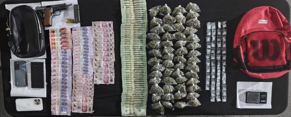 Al realizarle una revisión precautoria, le encontraron un arma corta abastecida con cinco balas, 53 envoltorios con hierba verde y seca con las características de la marihuana, 50 dosis de una sustancia sólida parecida al cristal, una báscula digital, mil dólares americanos, tres mil pesos en efectivo y tres celulares; por este motivo fue puesto a disposición del Ministerio Público para determinar su situación jurídica.