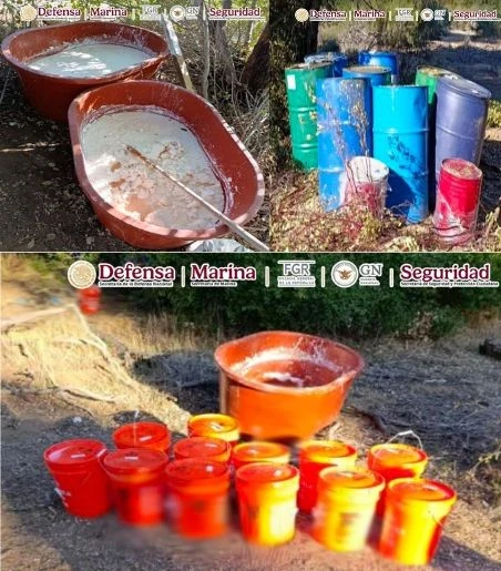 En el lugar se aseguraron más de mil litros y cien kilogramos de precursores químicos para la fabricación de drogas sintéticas, así como diversos cargamentos de droga y armamento.