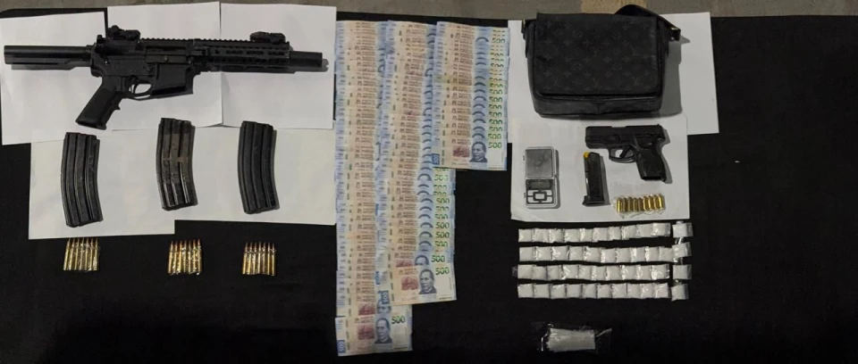 En una revisión se les aseguró un arma larga, un arma corta, dos cargadores, siete cartuchos, así como 44 bolsas con sustancia con características similares a la droga conocida como “cristal”, además de una báscula digital, dinero en efectivo y una camioneta.
