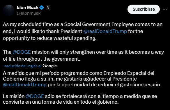 Musk dio a conocer su decisión a través de una publicación en su red social X, donde agradeció a Trump por la oportunidad de trabajar en el Departamento de Eficiencia Gubernamental. Además, aseguró que la misión de la dependencia seguirá fortaleciéndose.
