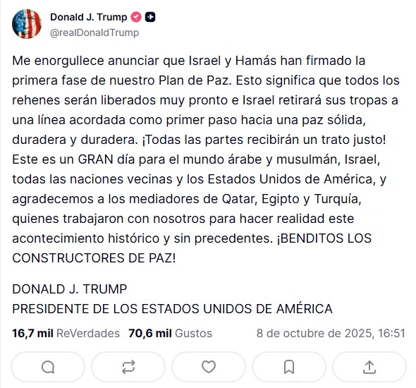 A través de Truth Social, señaló que la inteligencia confirmó que la embarcación transportaba drogas y estaba vinculada con redes narcoterroristas. Según la publicación la acometida se realizó en aguas internacionales.