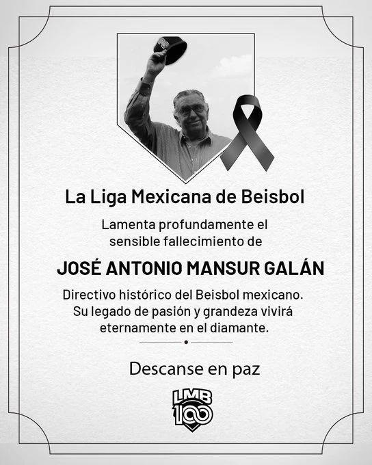 La Liga Mexicana de Beisbol lamenta con profundo pesar el sensible fallecimiento de Don José Antonio Mansur Galán, referente del Beisbol, nacional e internacional.