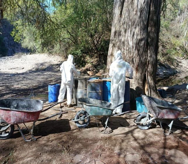 Como parte de las acciones contra la producción de drogas, en Sinaloa, el Ejército inhabilitó un área para la elaboración de metanfetamina y aseguró dos mil 220 litros de sustancias químicas, con una afectación económica estimada en 43 millones de pesos para la delincuencia organizada.