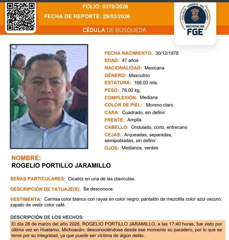 Rogelio Portillo Jaramillo, director de la Secretaría del Bienestar en Huetamo, Michoacán, fue reportado como desaparecido desde el 28 de marzo, luego de perder contacto mientras realizaba actividades laborales.