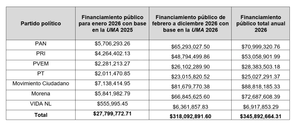 Las asignaciones por partido son: Movimiento Ciudadano: 88 millones 818 mil 185 pesos. Morena: 72 millones 687 mil 608 pesos. PAN: 70 millones 999 mil 321 pesos. PRI: 53 millones 58 mil 902 pesos. PVEM: 28 millones 383 mil 503 pesos. PT: 25 millones 27 mil 291 pesos. VIDA NL: 6 millones 917 mil 853 pesos.