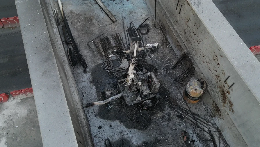 El equipo, ahora reducido a un armazón metálico calcinado, yace sobre el viaducto elevado.
