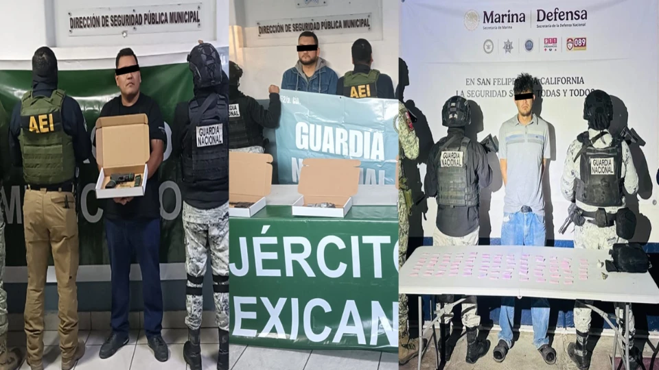 En Baja California, fuerzas federales y estatales detuvieron a tres personas y aseguraron tres armas cortas, cinco cargadores, 48 cartuchos, diversas dosis de metanfetamina y un vehículo, en los municipios de Tecate y Tijuana.