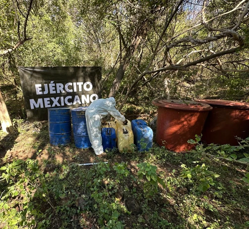 En Cosalá, Sinaloa, en los poblados Santa Cruz de Alaya, La Huerta y La Tasajera, elementos del Ejército Mexicano localizaron e inhabilitaron seis áreas de concentración de material diverso y aseguraron 7 mil 130 litros de sustancias químicas.