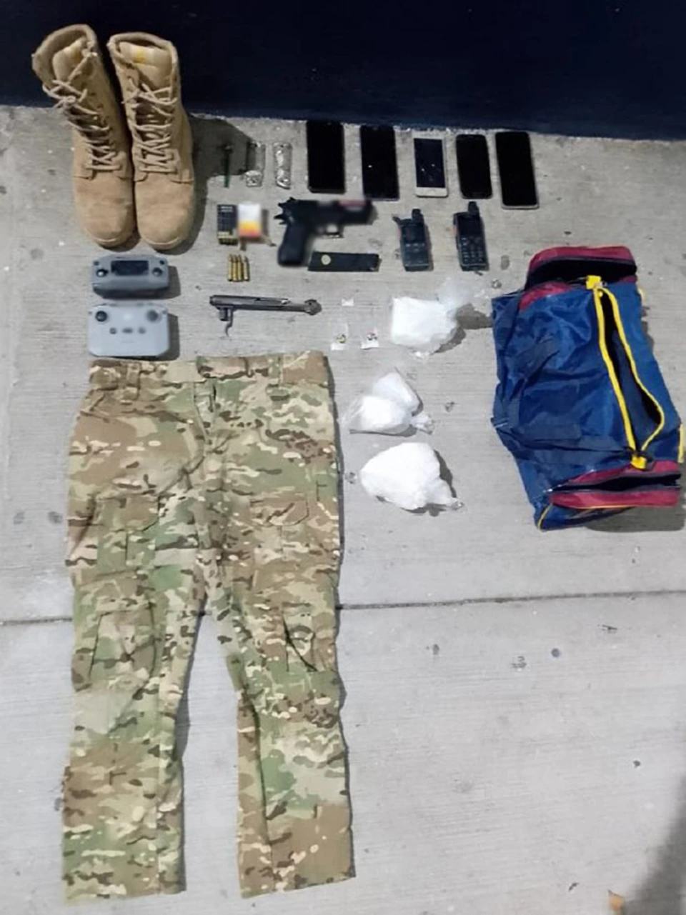 En Apatzingán, Michoacán, oficiales estatales y federales detuvieron a tres personas y aseguraron cinco teléfonos celulares, dos controles para dron, dos radios de comunicación, 14 cartuchos útiles, piezas de armas de fuego, una réplica de arma, un arma de fabricación artesanal y tres bolsas con droga.