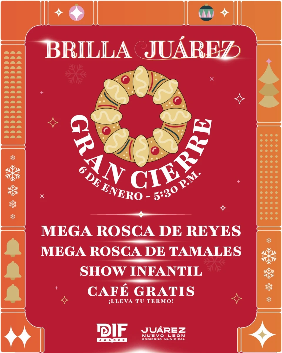 El municipio de Juárez, Nuevo León, cerrará este martes 6 de enero la segunda edición del festival Brilla Juárez con una gran celebración familiar y la tradicional Mega Rosca de Reyes.