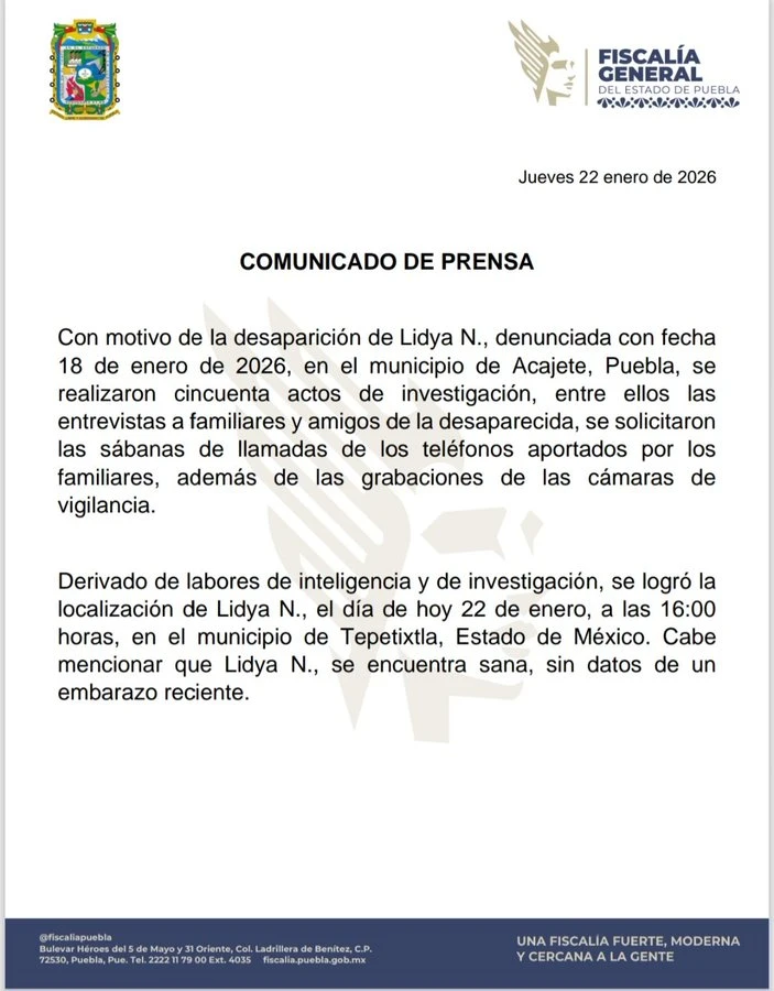 La Fiscalía General de la República de Puebla informó, mediante un comunicado que Lidya Valdivia Juárez fue localizada con vida este jueves alrededor de las 16:00 horas en Tepetixtla, Estado de México; sin embargo, precisó que no existen datos que confirmen un embarazo reciente.