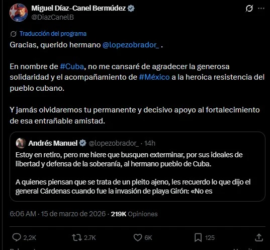 El presidente de Cuba, Miguel Díaz-Canel, agradeció públicamente al expresidente de México, Andrés Manuel López Obrador, por su respaldo y solidaridad hacia el pueblo cubano.