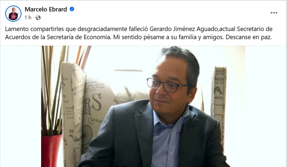 Gerardo Jiménez Aguado, secretario de Acuerdos de la Secretaría de Economía, falleció la tarde de este viernes, así lo confirmó el titular de la dependencia, Marcelo Ebrard.