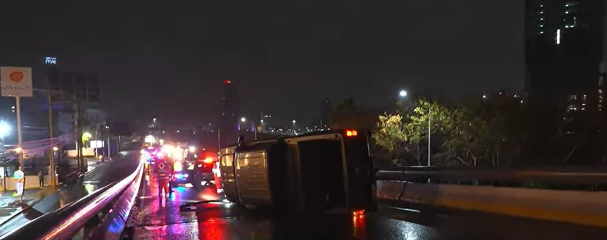 El presunto exceso de velocidad y el pavimento mojado causaron que un automovilista derrapara y volcara sobre la avenida Morones Prieto, a la altura de la colonia Loma Larga, en Monterrey, Nuevo León.