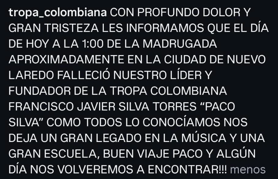 El cantante regiomontano Paco Silva, conocido por fundar y liderar la Tropa Colombiana en 1984, murió la madrugada de este domingo, informó dicha agrupación en sus redes sociales. Sin dar detalles y causas de su deceso, dijeron que ocurrió alrededor de la 1:00 de la madrugada en Nuevo Laredo, Tamaulipas.
