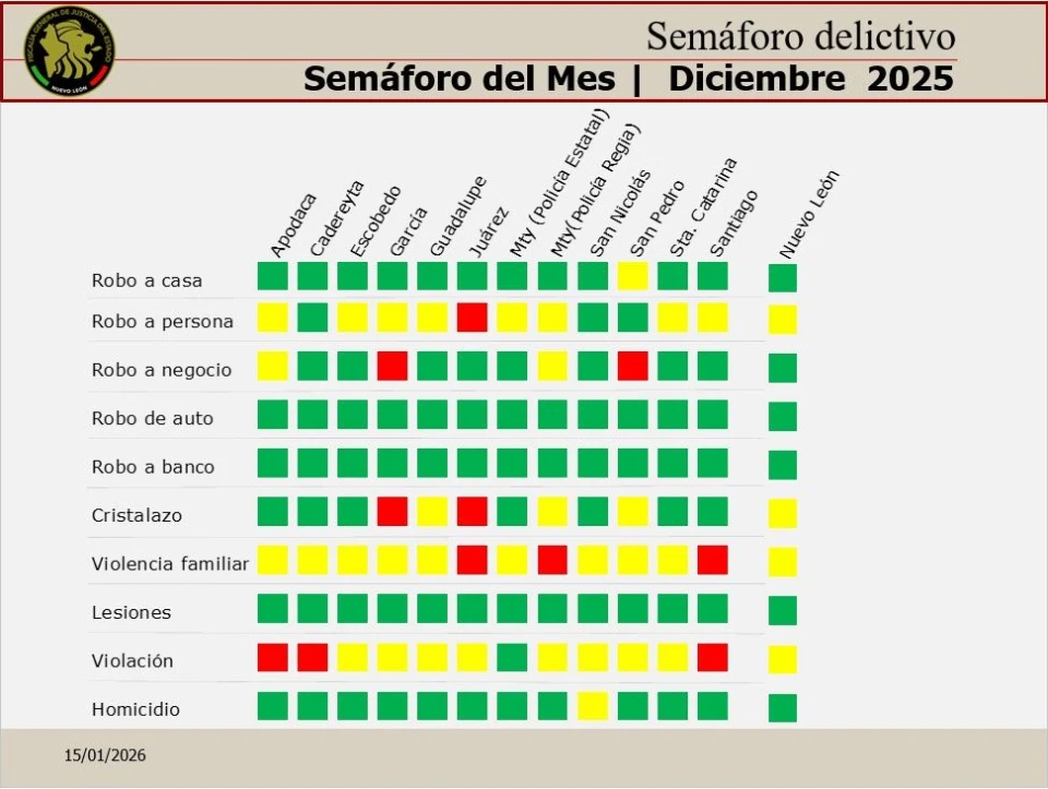 En cuanto a la herramienta de análisis de seguridad, se reportaron en color rojo los delitos de violación en los municipios de Apodaca, Cadereyta y Santiago, así como violencia familiar en Juárez, Monterrey —en zonas con cobertura de la Policía Regia— y Santiago.