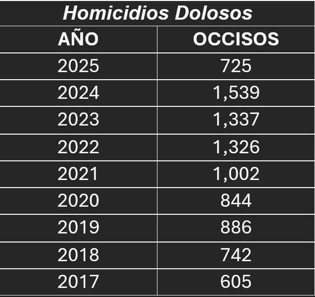 De acuerdo con estadísticas de la Fiscalía General de Justicia del Estado, el semáforo delictivo de diciembre se mantuvo en color verde en homicidios dolosos, con 43 casos registrados, y el año cerró con un total de 725 fallecidos, la cifra más baja en los últimos ocho años.