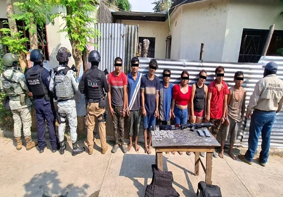 En Teapa, Tabasco, los elementos de seguridad, catearon un inmueble, dejando como resultado la captura de ocho personas, además se incautaron un arma larga, cargadores, 29 cartuchos, diversas dosis de sustancias ilícitas y dos chalecos tácticos.