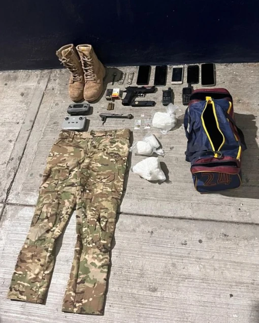 En la comunidad de Nexpa, un hombre abandonó una mochila al percatarse de la presencia de las autoridades; en su interior se localizaron un arma larga, una corta, 10 cargadores y 240 cartuchos de diversos calibres, un chaleco táctico y 15 bolsas de plástico de una sustancia similar a la cocaína.