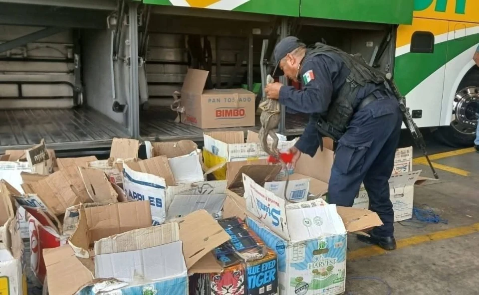 El hallazgo se registró en la terminal del municipio de Matías Romero, donde la unidad cubría la ruta Coatzacoalcos–Salina Cruz, un corredor identificado por el tráfico de fauna. Los reptiles viajaban en cajas sin ventilación ni condiciones adecuadas.