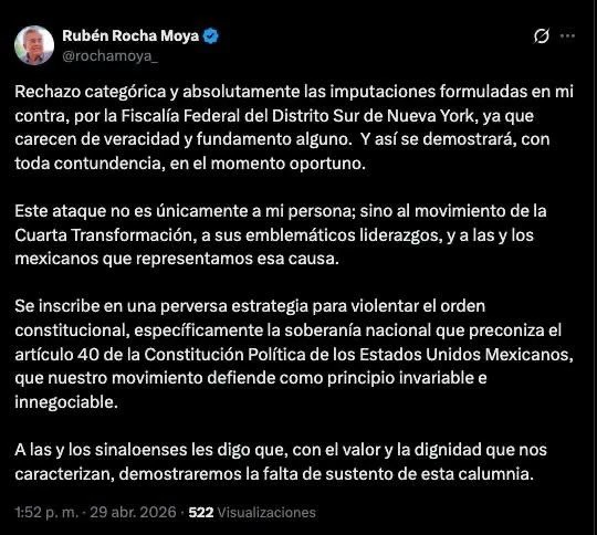 El gobernador de Sinaloa, Rubén Rocha Moya, rechazó de manera categórica las imputaciones en su contra presentadas por la Fiscalía Federal del Distrito Sur de Nueva York, que lo señalan por presuntos delitos de narcotráfico y vínculos con el Cártel de Sinaloa. A través de redes sociales, el mandatario aseguró que los señalamientos carecen de sustento y confió en que serán desestimados conforme avance el proceso legal.