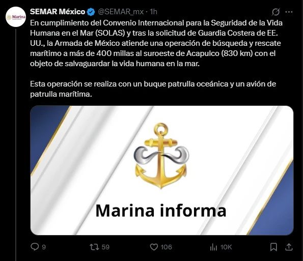 La Secretaría de Marina (Semar) activó el martes un operativo de búsqueda y rescate en el Pacífico, tras recibir una solicitud de auxilio de la Guardia Costera de Estados Unidos.