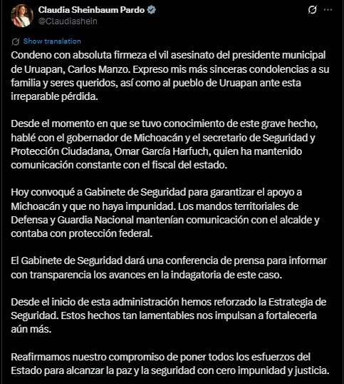 La presidenta de México, Claudia Sheinbaum Pardo condenó “con absoluta firmeza” el asesinato del alcalde de Uruapan, Carlos Manzo, ocurrido la noche del sábado, y expresó sus condolencias a su familia y al pueblo michoacano.